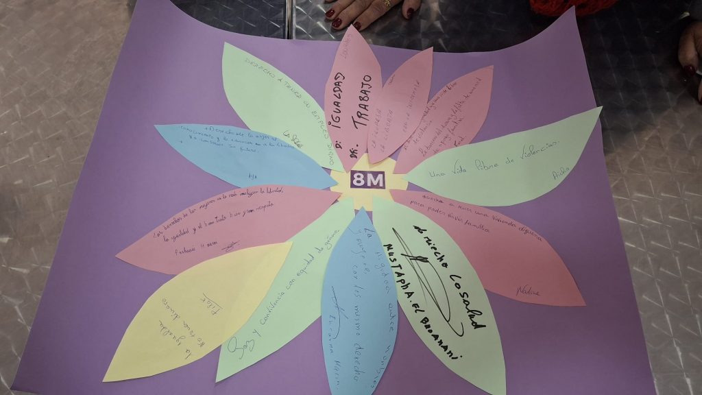 Con motivo del 8M, hemos impulsado diversas dinámicas —La Flor de los Derechos, Las Gafas Lila y la elaboración de cartelería conmemorativa— para fomentar el apoyo mutuo, la toma de conciencia sobre derechos e igualdad, la participación activa y el empoderamiento de las mujeres que acompañamos.